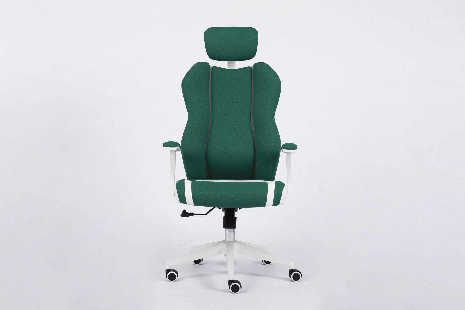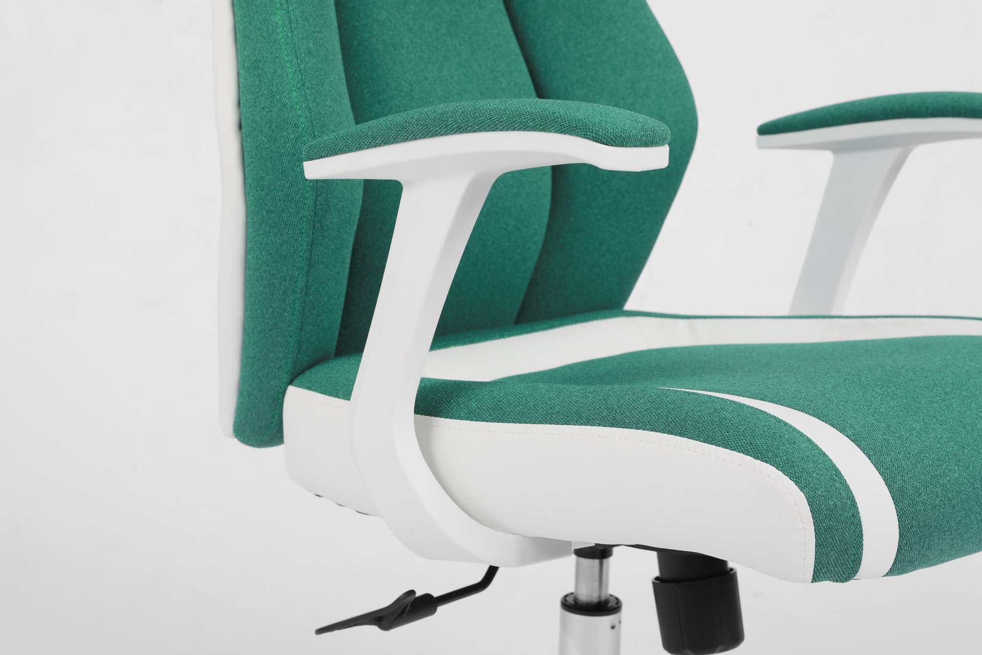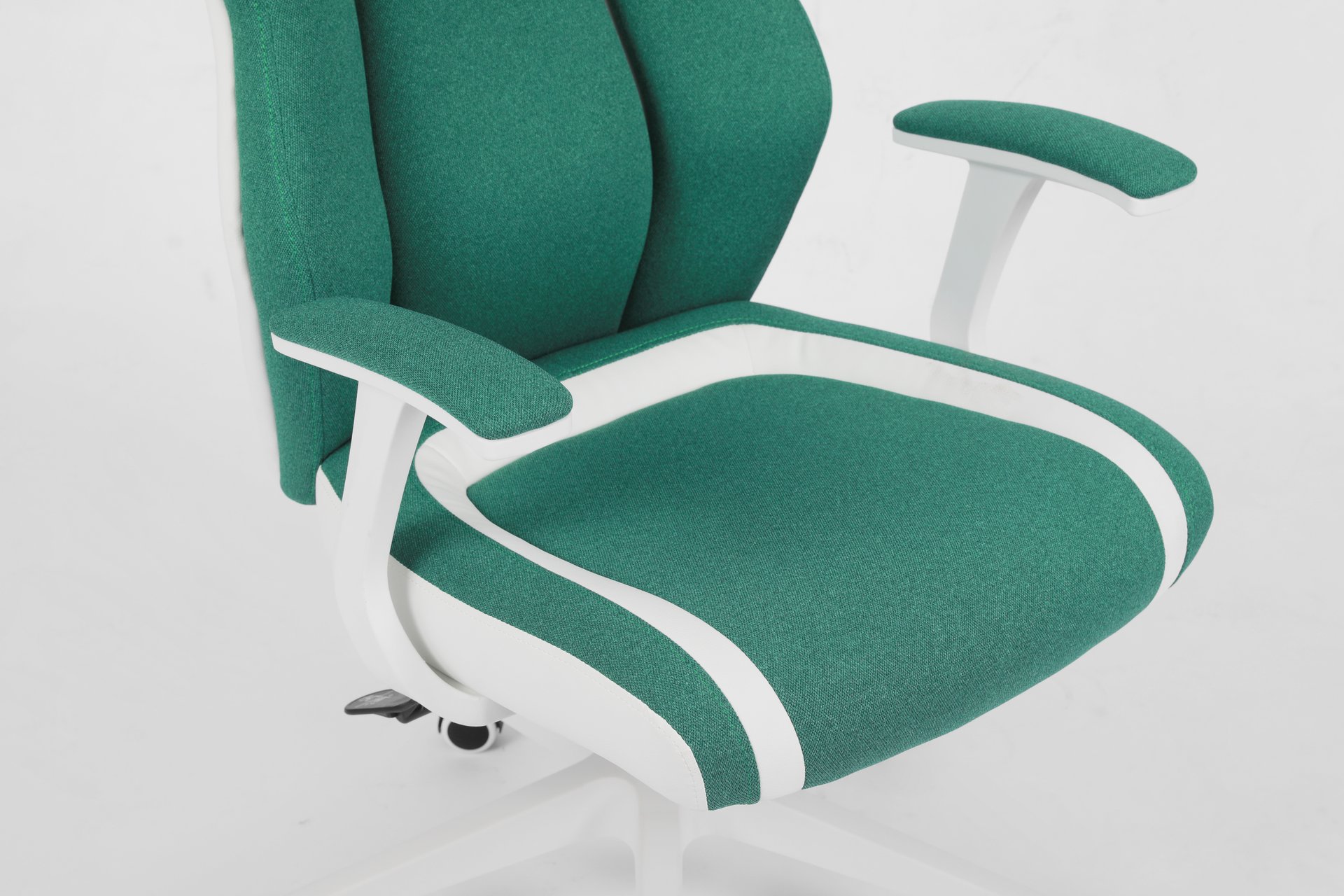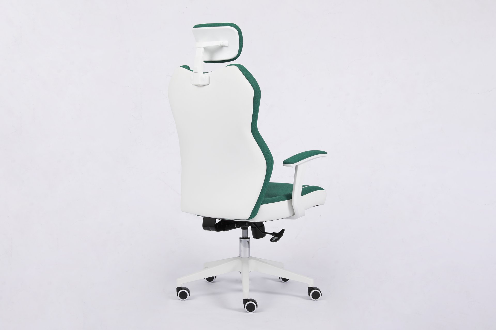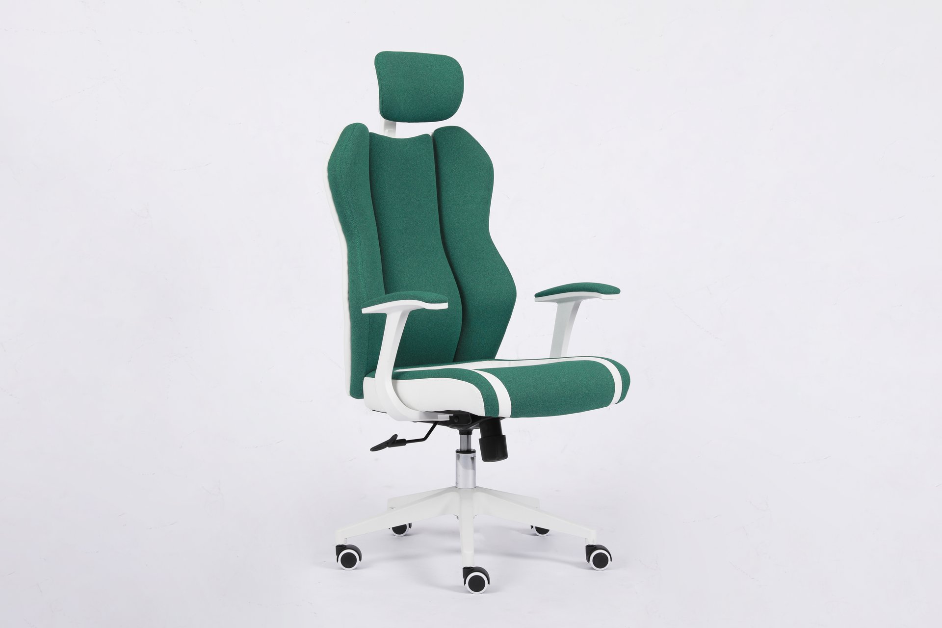 This is a newly designed and stylish office chair. It features a 3-piece segmented backrest with green fabric, bringing a vibrant, spring-like feel. Paired with white leather upholstery and white accessories, the chair presents a clean and fresh look that fits perfectly with European aesthetics. This model has already been ordered by many customers and is well received in the market.