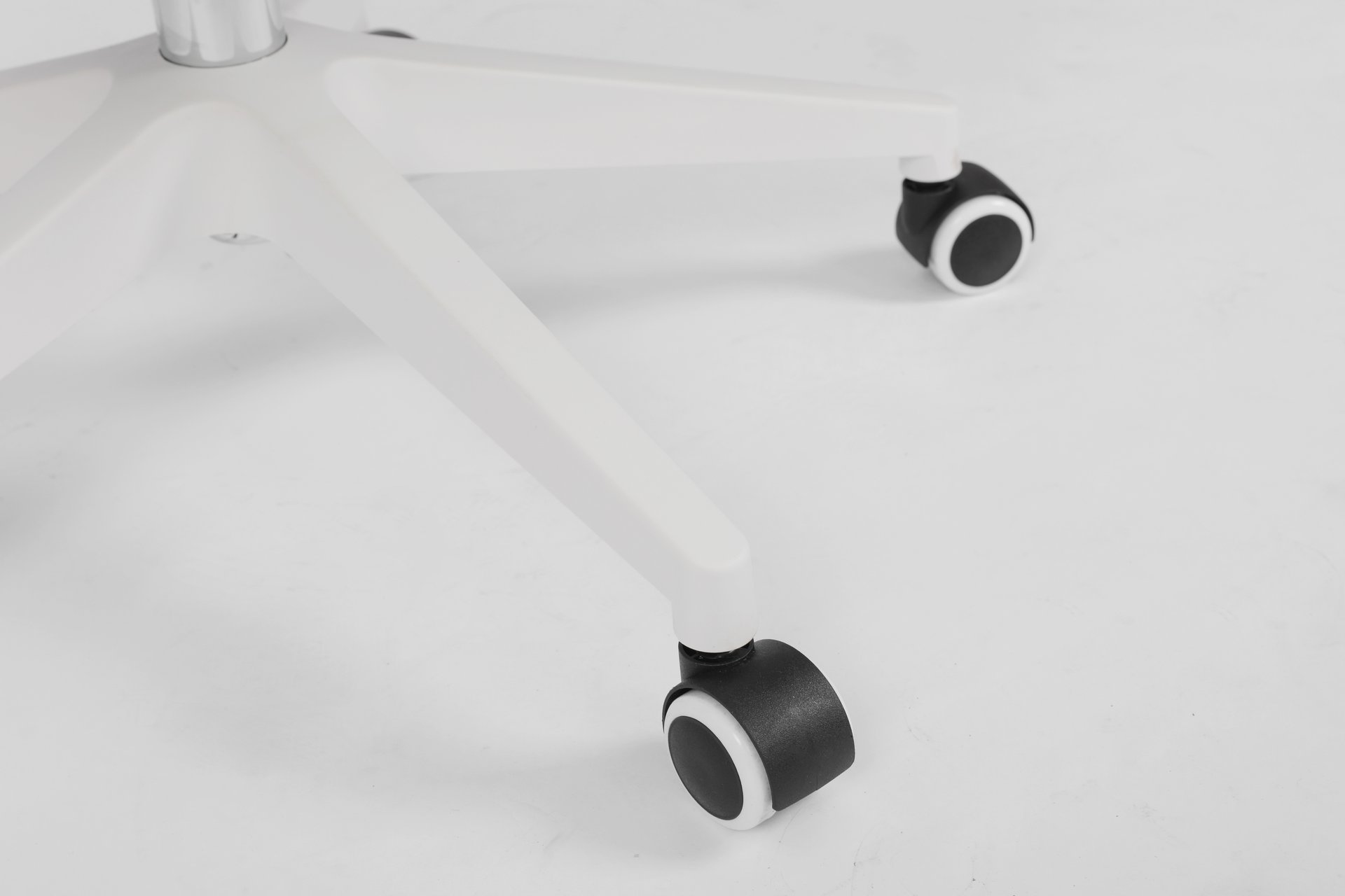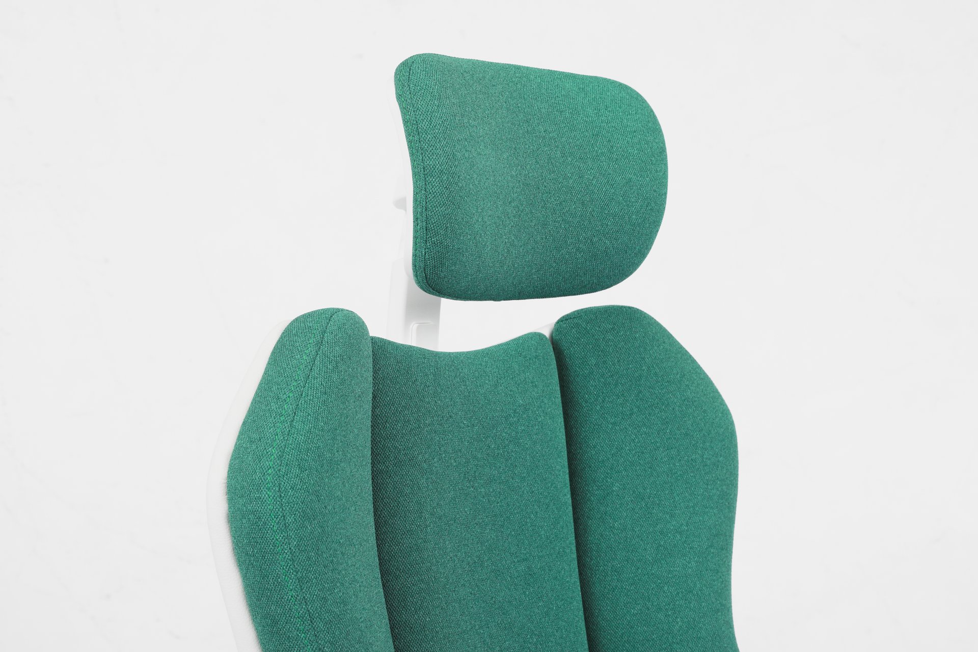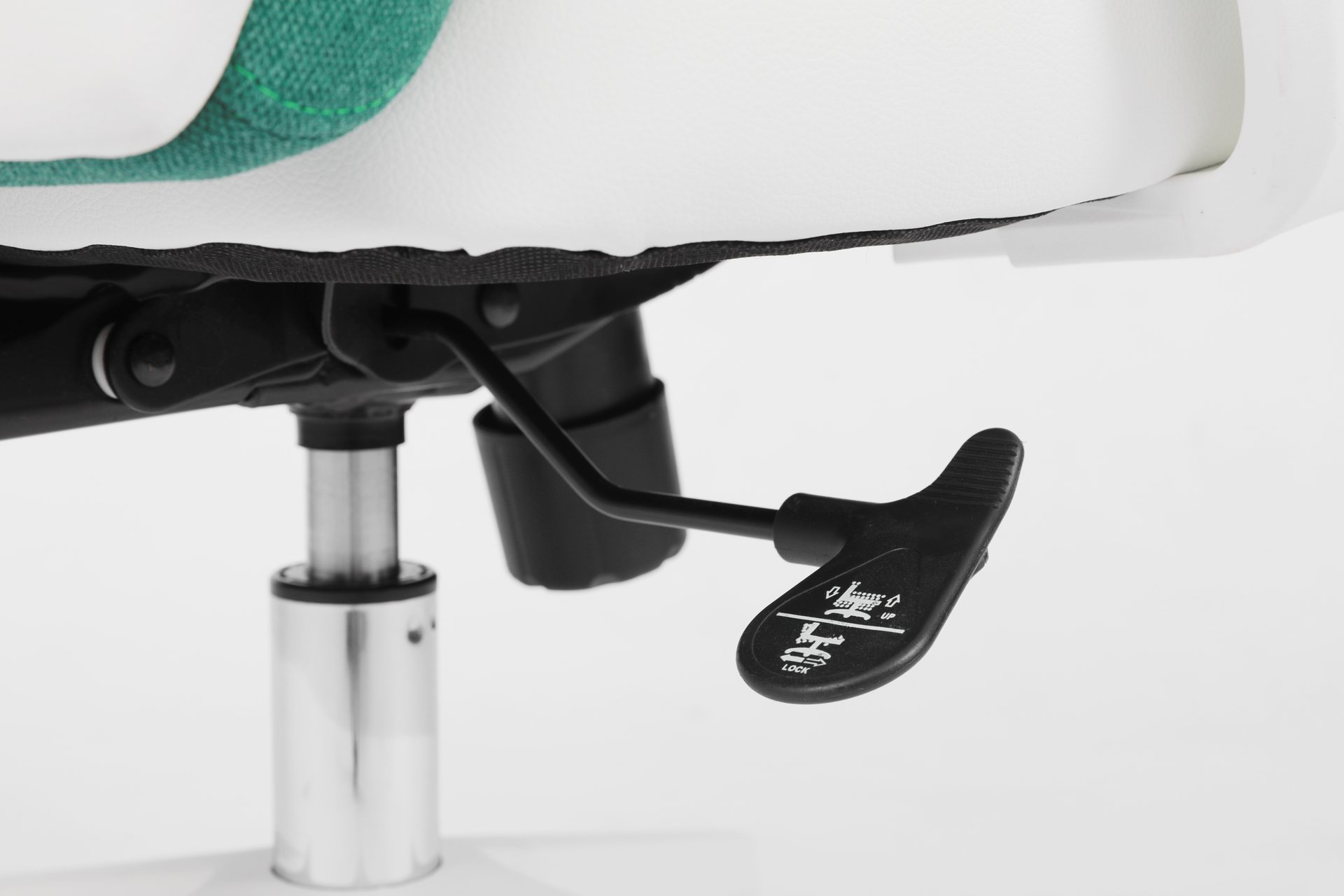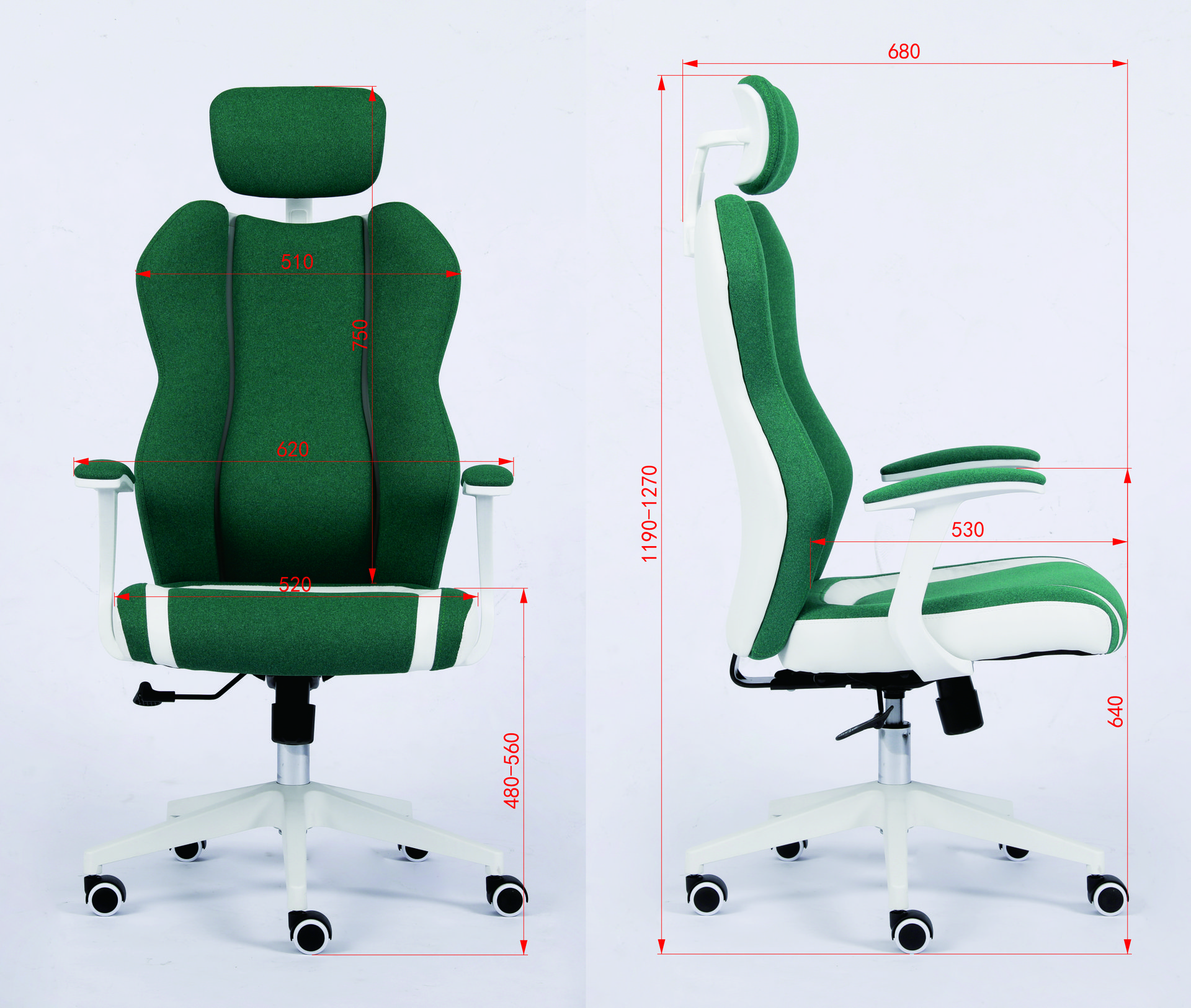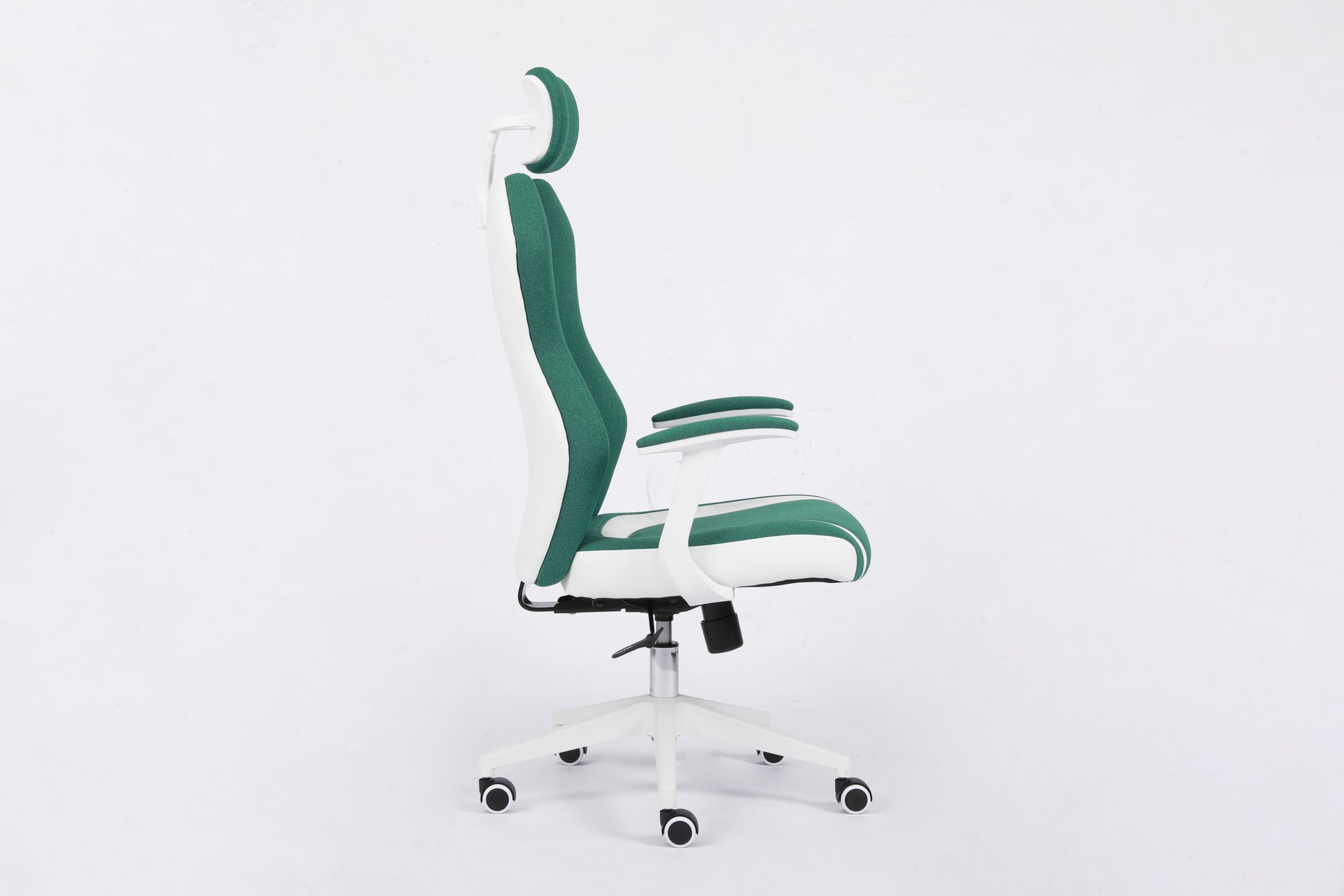 This is a newly designed and stylish office chair. It features a 3-piece segmented backrest with green fabric, bringing a vibrant, spring-like feel. Paired with white leather upholstery and white accessories, the chair presents a clean and fresh look that fits perfectly with European aesthetics. This model has already been ordered by many customers and is well received in the market.